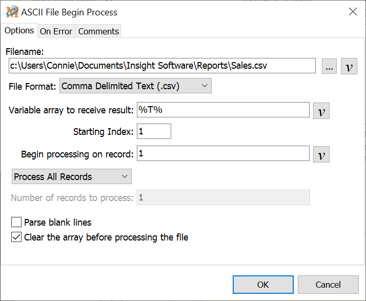 Use this option to select which record to begin processing in the file. To process the entire file, enter 1 in the value field to indicate starting with the first record. Or use an Integer variable when specifying which record to start processing and the number of records to process.