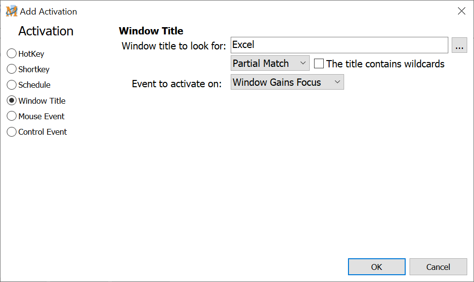 Click on the Add button to open the Add Activation window, as shown below. Use this window to add a second or third activation type to your macro.