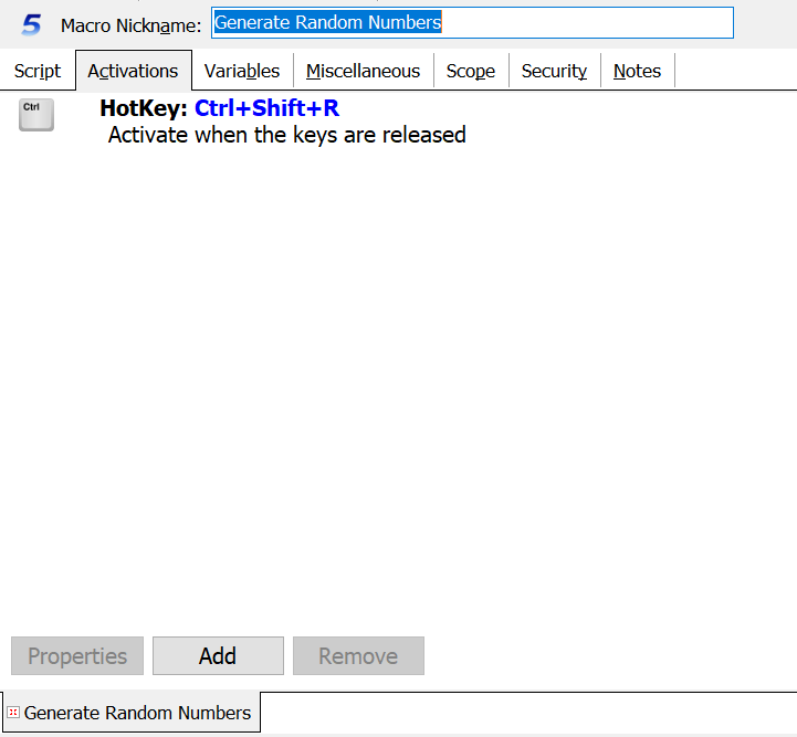 To view the Properties, highlight an activation listed and click on the Properties button. This opens an edit field where changes may be made to the activation selected. For example if the activation is a hot key of Ctrl+Shift+R, assign the activation to another combination.
