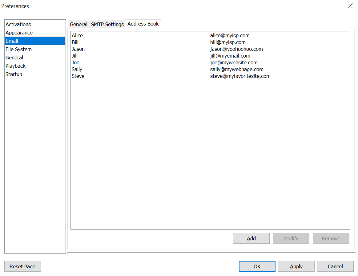 The Address Book is a list of names and email addresses to choose from when creating email macros. Use this function to add names, make changes to existing names or delete names from the list. Click on Options > Preferences > Email to access this option. The Email Send command also has an option for editing the list of email recipients.