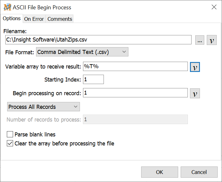 ASCII File Begin Process: C:\Insight Software\UtahZips.csv Text Type (Simulate Keystrokes): %T[1]% %T[2]% %T[4]% %T[5]% %T[6]% %T[7]%
