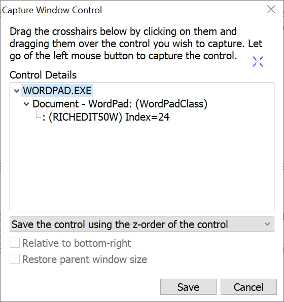To select a Window Control place the mouse cursor on the crosshair image, hold down the left mouse button and drag the mouse over the control. When dragging the crosshairs over title bars, buttons, edit boxes, forms, toolbars, etc., the outline of the controls are highlighted. Once the control needed is highlighted, release the left mouse button. Click on the Save button to return to the Create New Macro window. The control details are saved in the edit box.
