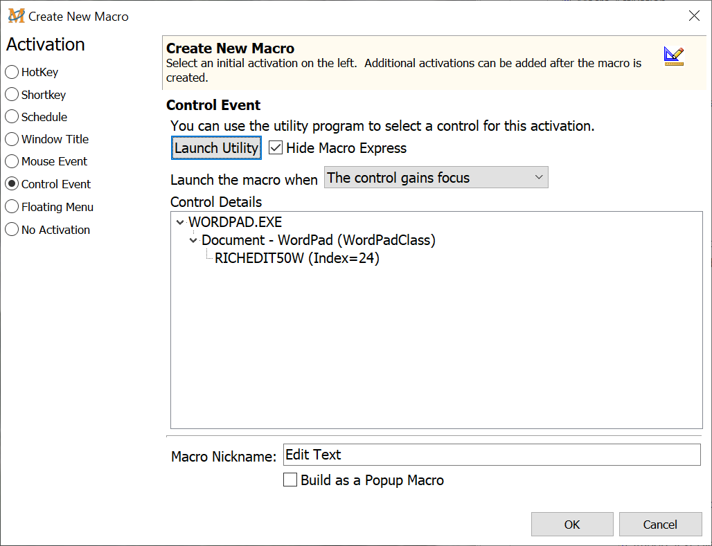 With Control Activation selected, the macro plays back when the control gains focus or the window with the control gains focus. In the example above the control name is listed. The program .exe is displayed followed by the window component that must be active in order for the macro to play back.