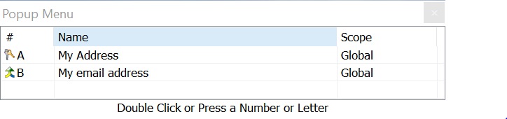 A menu like the one above should appear, listing the two macros previously defined. Either press the corresponding letter or number next to the macro or double click on the macro in the menu to run the selected macro in notepad.