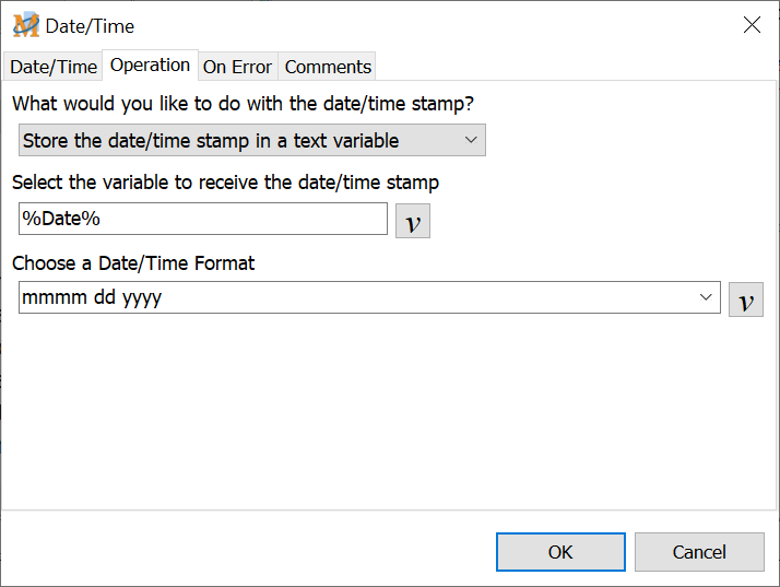 This places the date and/or time into a text string variable. Select or create the text string variable to store the date/time information.