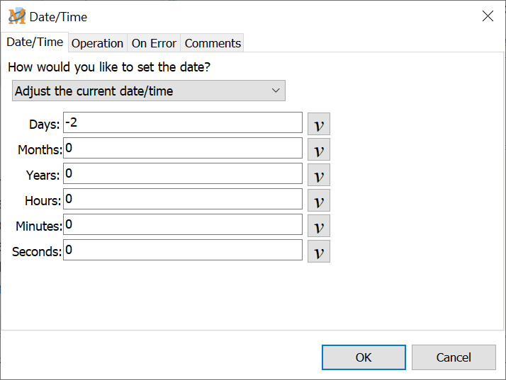 Adjust the date or time by Days, Months, Years, Hours, Minutes or Seconds into the future or past. The calculations are based on the computer's current system time and date. Insert negative numbers in the fields to adjust the date or time to the past.
