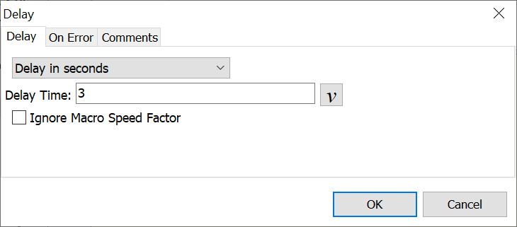 The Timed Delay in Seconds option puts Macro Express into a "wait state" where virtually no CPU cycles are used, thus allowing CPU intensive programs to continue uninhibited. This is similar to the Wait for Time to Elapse command. Select either the Timed delay in seconds or Timed delay in milliseconds option and then enter the number of seconds or milliseconds in the Delay Time edit box.