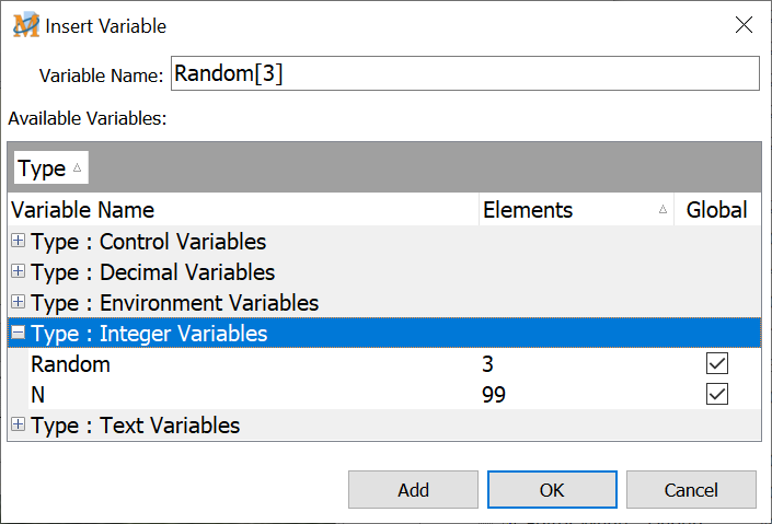 Click on the Variables button to open the Insert Variables window and choose a variable to play back in a macro. Select the variable from the variable types available and click on the OK button. This places the variable into the Macro Text at the location where the cursor is positioned. Or click on the Add button to name a new variable to use in the macro.