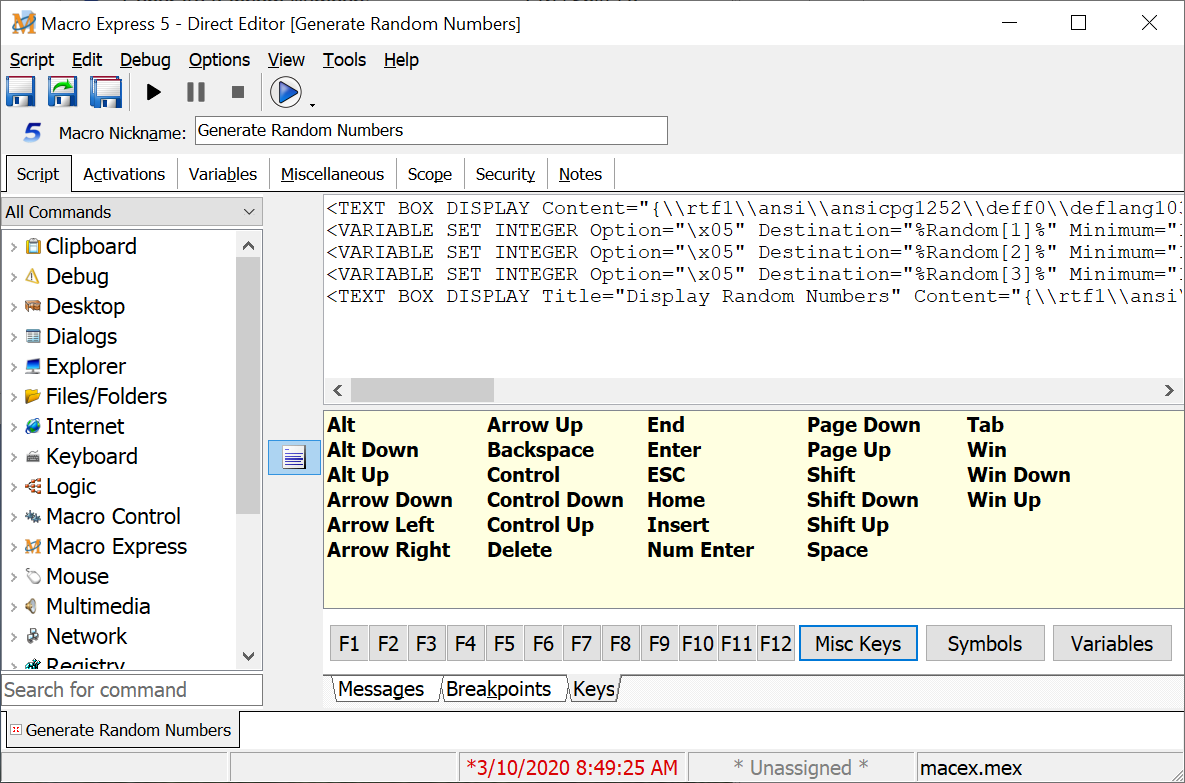 The Script tab contains the list of commands and the macro script. Additional information about the macro can be viewed or edited in the Activations, Variables, Miscellaneous, Scope, Security and Notes tabs.