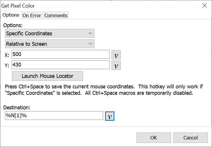 With this option assign the specific mouse coordinates based on the active window or the entire screen. Insert the X and Y coordinates of the pixel to find.