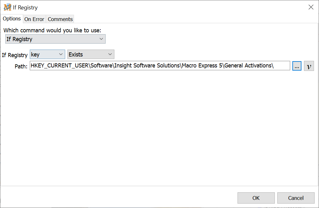 This section consists of two parts. Select either registry value or registry key. Then select the If Exists or Does not Exist option. The macro determines if the registry key or value exists or does not exist on the computer.