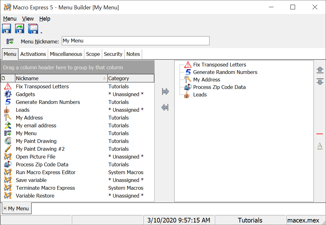 Macro Express Explorer > Double click on existing Popup menu or Macro > Add Macro > Select Activation and Build as a Popup Menu > Click OK
