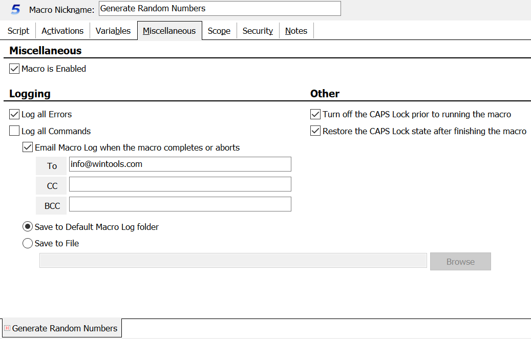 The logging option captures any error message or command logging in the macro. Decide what to log and where to store the information. The information may also be viewed by right clicking on the macro in the Macro Explorer window. Left click on Macro Properties from the menu that opens. Then click on the Logging tag to see the results.