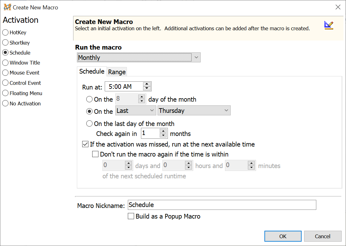 If the scheduled activation was missed, it may not be desirable to run the macro twice within a relatively short period of time. If this is the case, then insert a value such as 10 in the days field. If the computer is restarted on the second Monday after being on vacation and the macro is scheduled to run on the third Tuesday, the