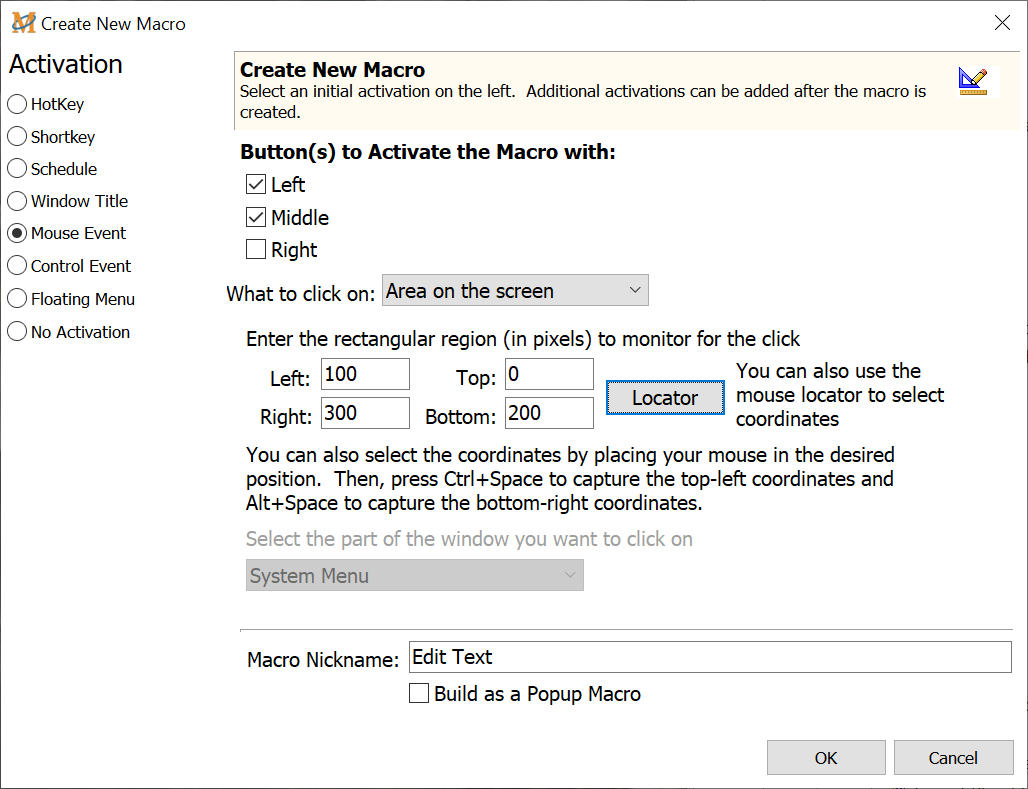 Use this option to define regions on a window that can be assigned as a mouse activated macro. Clicking on this area of the window triggers the macro. This option requires the input of four pixel coordinates - Left, Top, Right, and Bottom. Click on the area within these four pixel coordinates to start the macro.