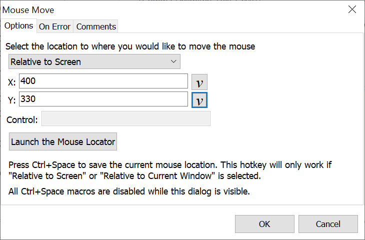 üNote 1: When using the Relative to Screen or Relative to Window options, open the Mouse Locator and position the mouse to the desired location. Then press the Ctrl Key and Space Bar to insert the coordinates into the X and Y fields.
