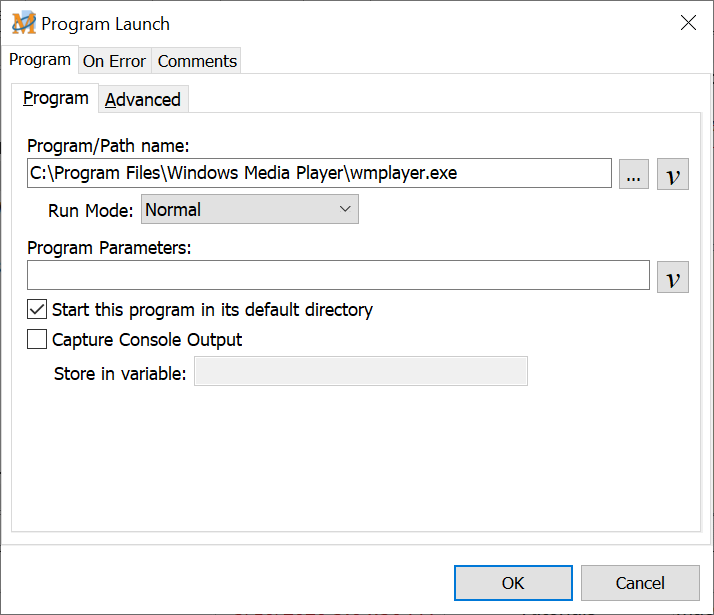 The Program Launch command instructs the macro to start a specific program. If the program cannot be found, the macro terminates. This option may not display the launched program on top of other programs currently running. To ensure that the program window opens at program launch, use the Launch Program and Activate Window command.