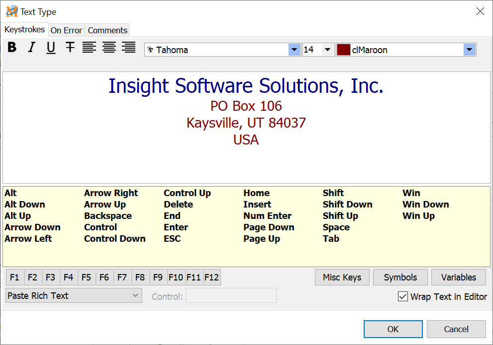 Macro Express has the ability to play back text in a rich text format. Select the Paste Rich Text option from the drop down menu to display the rich text editor options. Create the rich text content directly in the Text Type command or copy the rich text from another source and paste it into the edit box.