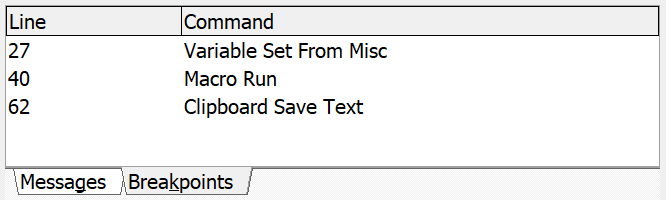 This tab displays any breakpoints that were defined in the macro for debugging purposes. The line in the script and the command with the breakpoint are displayed.