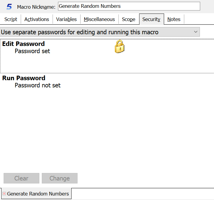 Select this option and click on the Change button to create a password. With the password information defined, the password must be entered before viewing or editing the contents of the macro in the Script Editor. This same password is also required before running the macro.