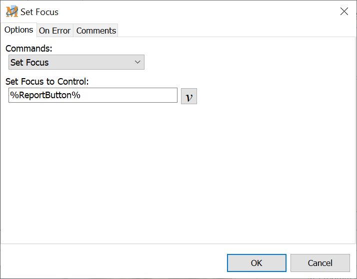 Set Focus is similar to the Window Activate command, but uses a control instead. It brings the window that contains the selected control to the front and then sets focus to the control. This is most useful for edit box controls. Set focus to the edit box and then use the Text Type command to insert text, etc.