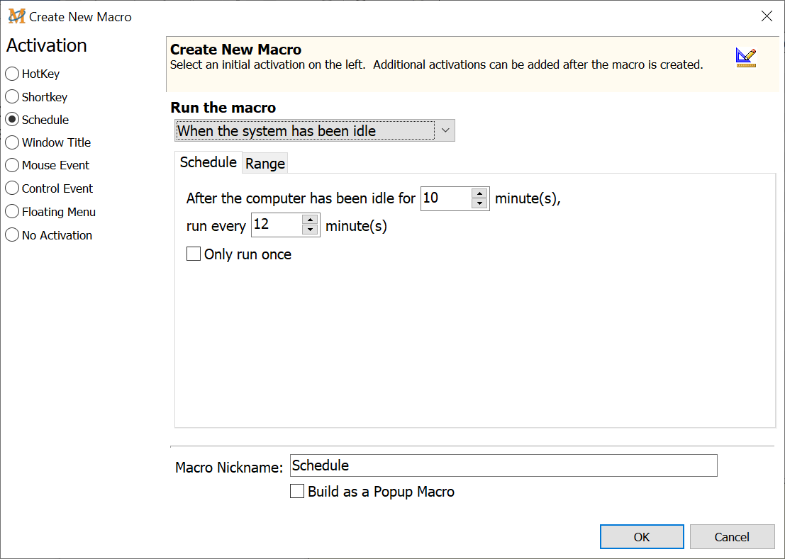 Example In the image above, the scheduler waits for the system to be idle for 10 minutes. The macro waits 12 minutes before running the macro.