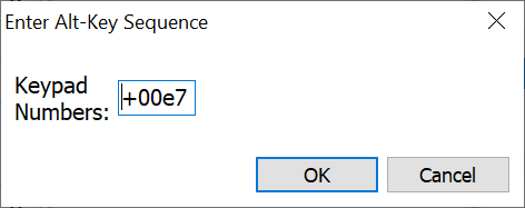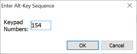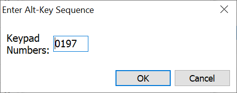 Use this option to embed an Alt-Key Sequence directly into a macro. The Alt-Key Sequence is a method of inserting symbols into most Windows applications and is done by holding the ALT key down and pressing digits on the numeric keypad. Clicking on the "Alt-Key Sequence" button presents a window requesting the numeric digits that would typically be typed via the numeric keypad.