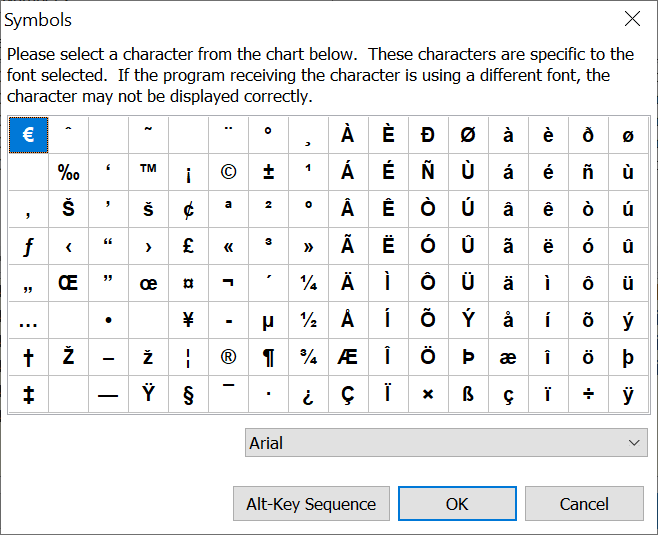 Select the font from the drop down list. Symbols associated with the font selected are displayed. The program default is the Arial font.