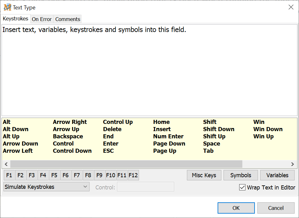 When in the Script Editor, use this window to enter text and a variety of other keystrokes as part of the macro script. The text or keystrokes play back into the application that is open when running the macro. The Text Type command is not necessary when using the Direct Editor. Text and the keystrokes displayed below may be input directly to the Direct Editor.