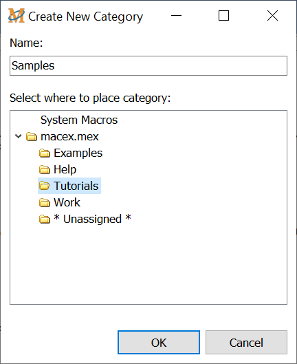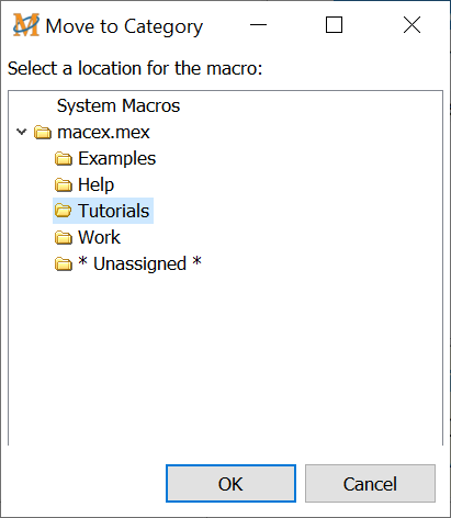 Highlight the macro to be assigned and click on Macros > Move to Category to display a list of categories such as in the example below. Choose the category to move the macro into and press the OK button. The macro is now assigned to the category selected.