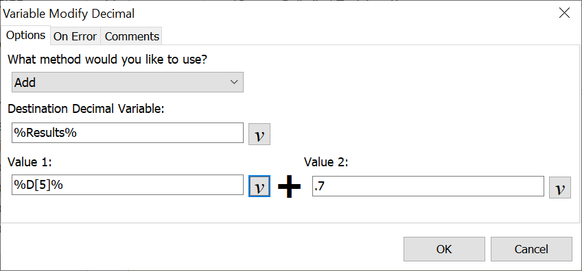 Insert either a decimal value or a decimal variable into these fields. The values are added and saved to the variable selected.