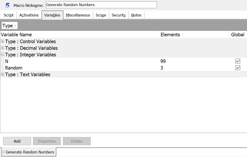 Click on the Add button to create a new variable for use in the macro. The Variable Properties window, as shown below, opens, allowing the creation of additional variables. This option does not allow for assigning values to a variable. Use this function to create the variable name and type. Use the Variable commands to assign values to variables.