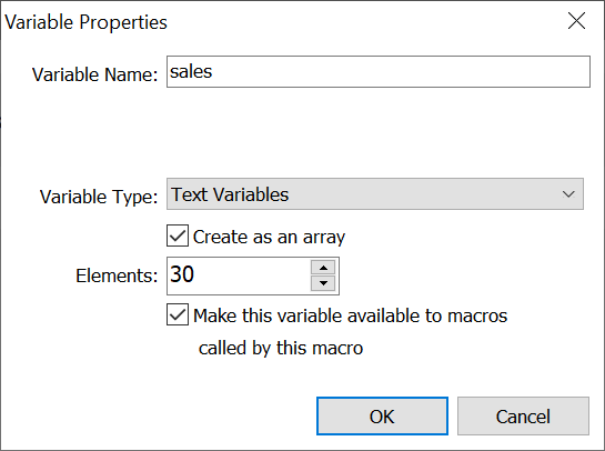Select the number of elements to place in the array. In the example above, 30 elements have been selected, allowing for the use of up to 30 variables in the array. Array elements start with [1] and not [0]. The variable format looks like the following: