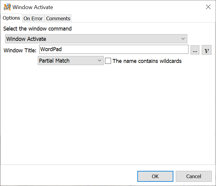 Select this option if a wildcard is included in the window title name. A wildcard uses the " * " or " ? " characters in the title to expand the possibilities of a match. These are similar to the wildcards used in Windows for searches.