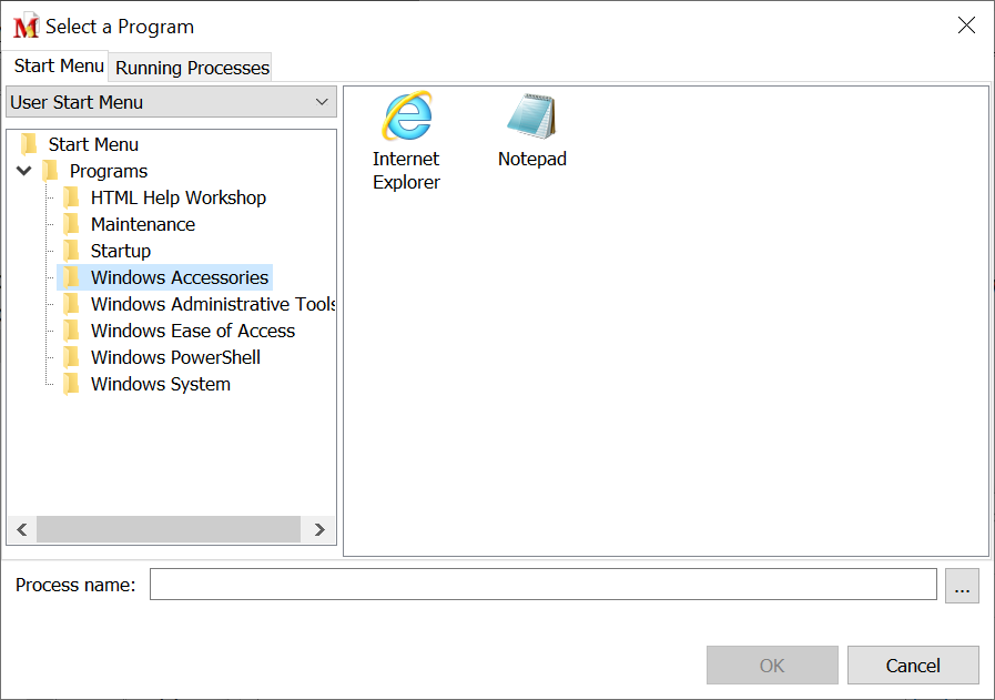 This window or similar is used in several places throughout the program, such as selecting a program specific scope, using the Terminate Process command, the Program Launch command and others that require selecting a program.