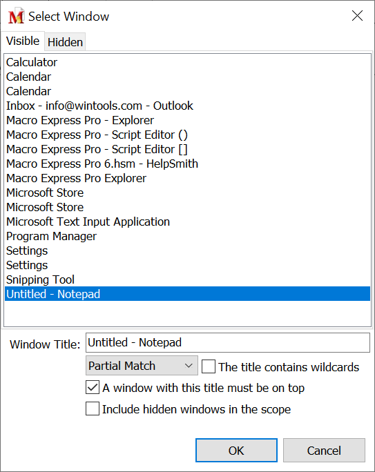 By default the macro will only look for windows that are visible, not those that run hidden and are not seen by the user. Select this option to have the scope apply to the windows listed in the Hidden tab, as well as those that are visible.