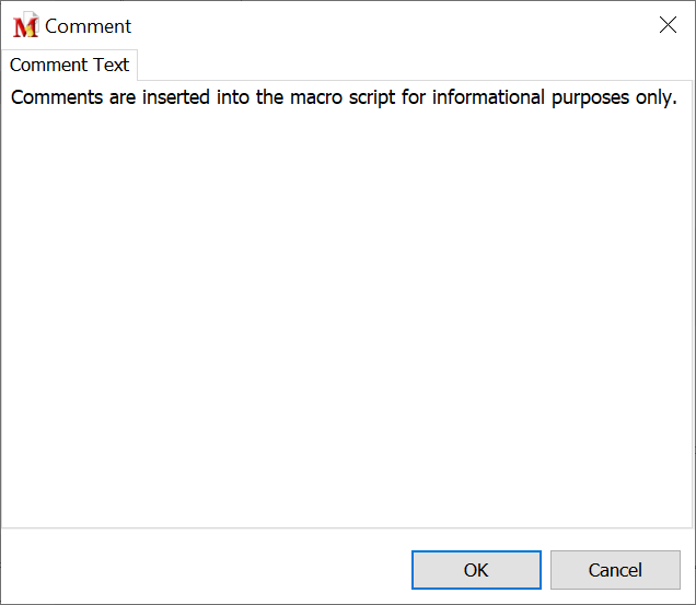 In the edit box, insert the comments and click OK to save. The comments are inserted into the macro script where positioned. The comments are displayed in blue text in the Script Editor to easily distinguish comments from other commands.