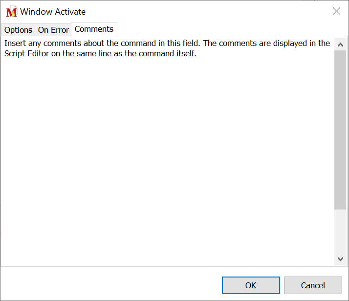 The Comments tab is found in any of the macro command windows. Insert comments about the command into the edit field - what it is supposed to do, why, etc. The comments appear in the Script Editor on the same line in the script as the command. The comments text displays as blue text to be distinguishable from the command text.