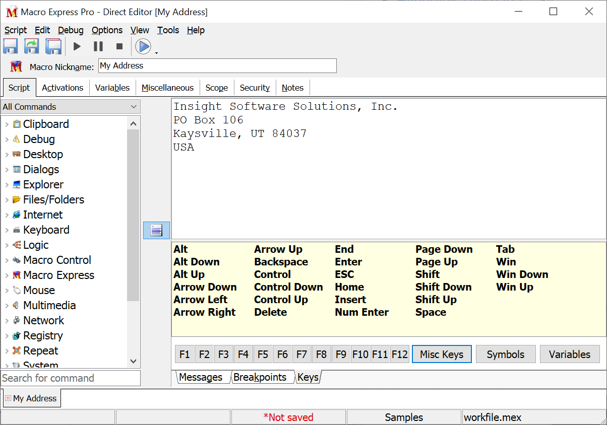 4.Open the Macro Explorer window to see the newly defined macro, My Address, added to the list of available macros.