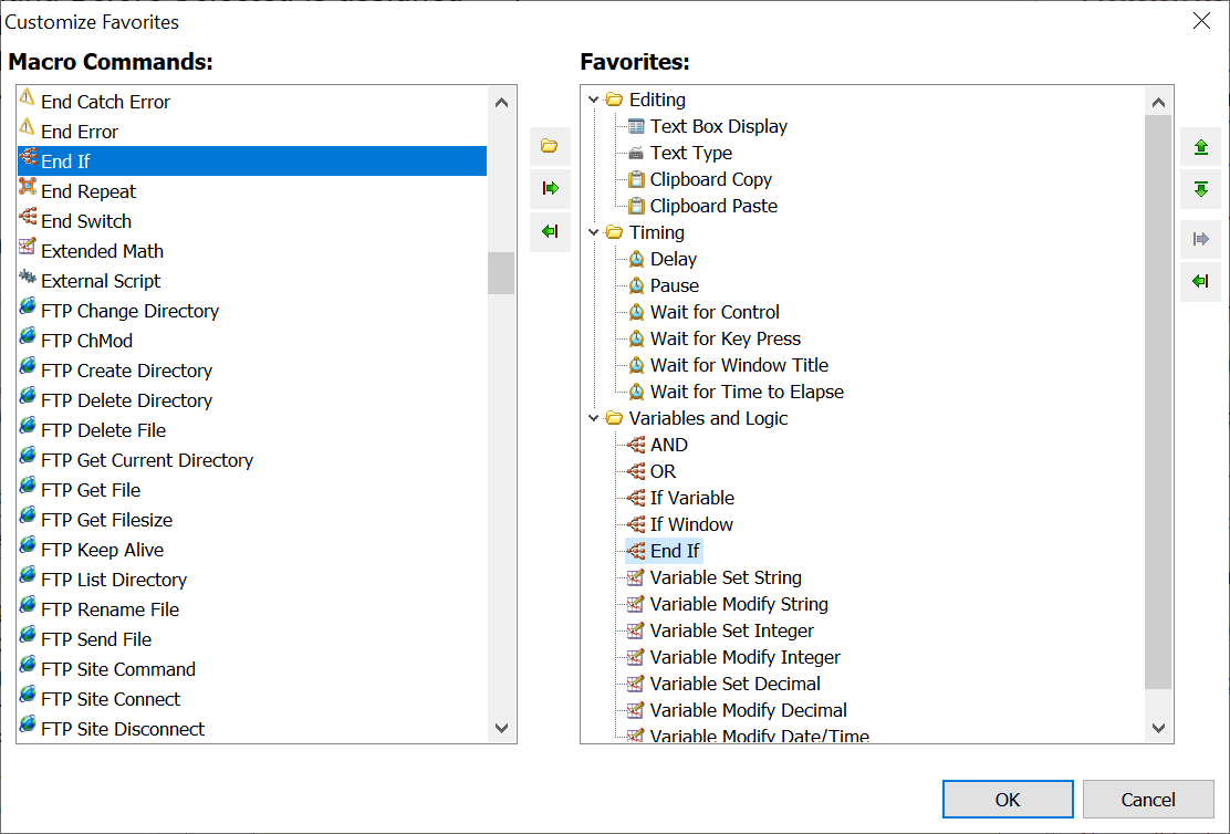 Use this Customize Favorites option to create a favorites list. Select the command and click on the insert button to move it to the Favorites column. Click on the Folder icon to insert a folder in the Favorites field. The directional buttons on the right of the window allow for positioning the command in the Favorites list. When finished, click on the OK button to save.