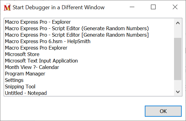 For example if the first line of the macro types text, then select a window from the list where the text can be inserted. The macro needs to know where to type the text during the debug testing. With the (Don't Switch Focus) option the macro will attempt to insert the text into Macro Express, since this is the window that currently has focus.