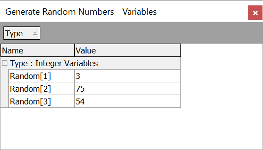 The values of the variables are displayed in a separate window when debugging a macro. Use this window to determine that the correct values are being saved to the variables. The window displays the variable type, variable name and the corresponding value.