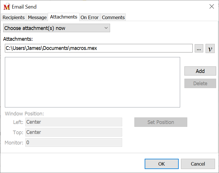 Use this option to select the email attachment during macro design time. Click on the Browse button to locate and select the attachment file. Then click on the Add button to add to the list of attachments. Variables may also be used as part of the attachment file name.
