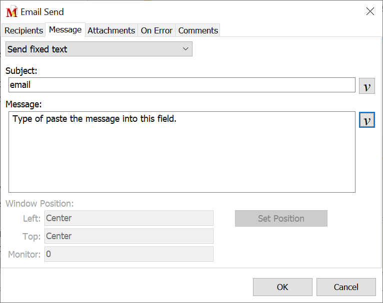 The fixed text option sends the same fixed text email message each time the macro is invoked. Enter the message subject in the appropriate field and the email message into the Message edit box.