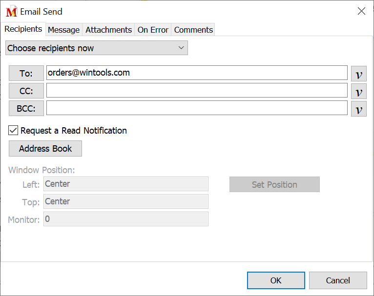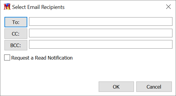 The Prompt for Recipients at Runtime option displays a window similar to the one shown below during playback of the macro. Enter the email address or addresses of those to receive the email in the appropriate fields. Or click on the To, CC or BCC buttons to insert an address from the Address Book.