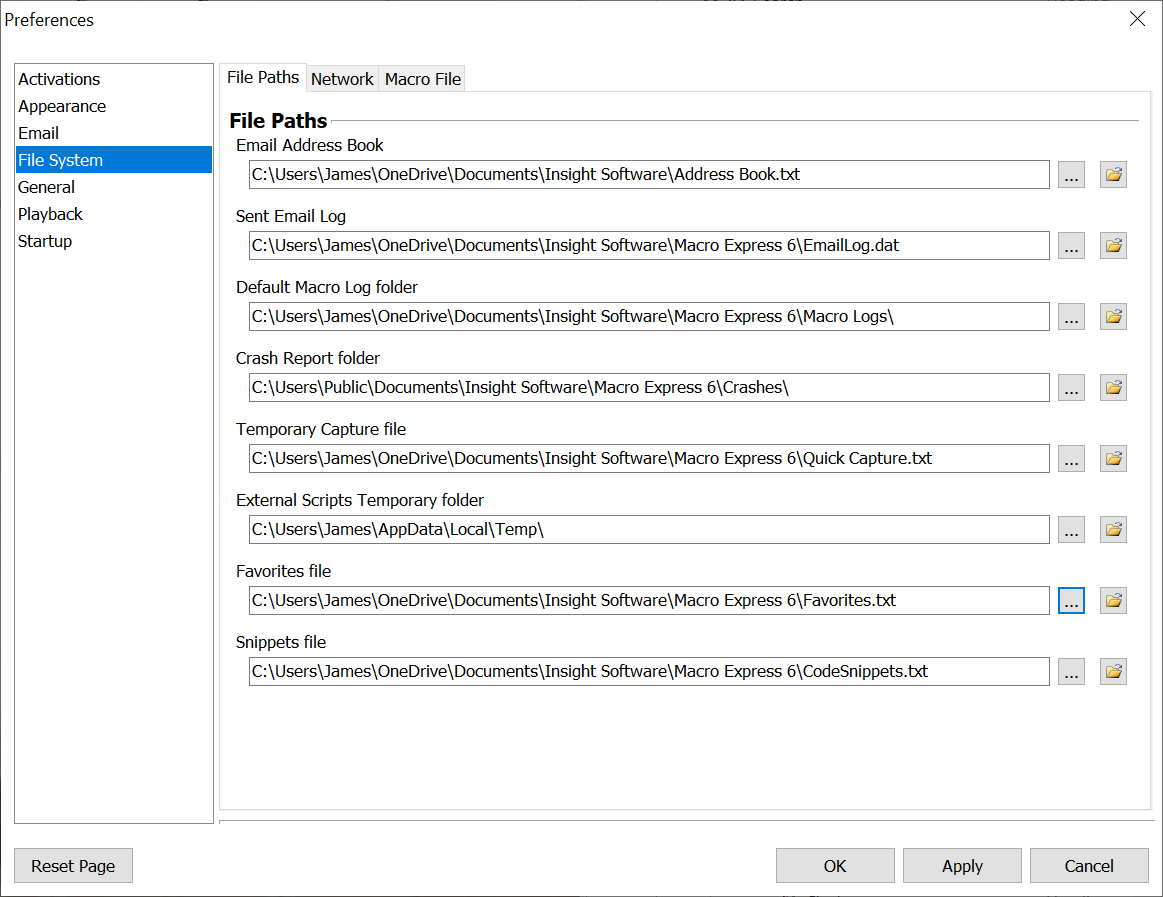 Macro Express Explorer > Options > Preferences > File System > File Paths
