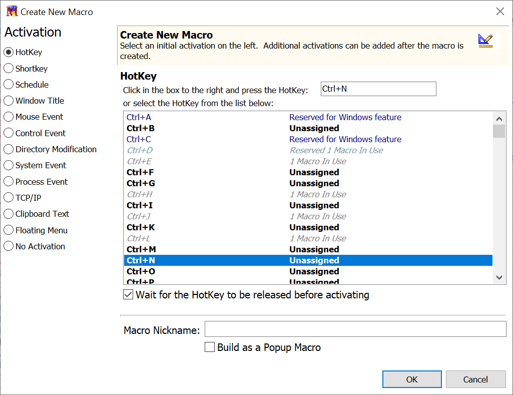 To activate a new macro with a hot key, select the HotKey option in the Create New Macro window. Place the cursor in the edit box and hold down the hot key combination wanted. That combination is inserted in the edit box and will be the combination used to activate the macro.