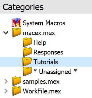 Upon installation there are three default categories - System Macros, All Categories and Unassigned. These categories may not be renamed or deleted. Additional categories may be created as shown in this example. Since Macro Express allows more than one macro file to be open at a time, multiple sets of categories may be displayed - a set for each open file.
