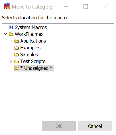Use this menu command to assign macros to categories already created. Highlight the macro to be assigned and click on Macros > Move to Category to display a list of categories such as in the example below. Highlight the category to move the macro into and press the OK button. The macro is now assigned to the category selected.