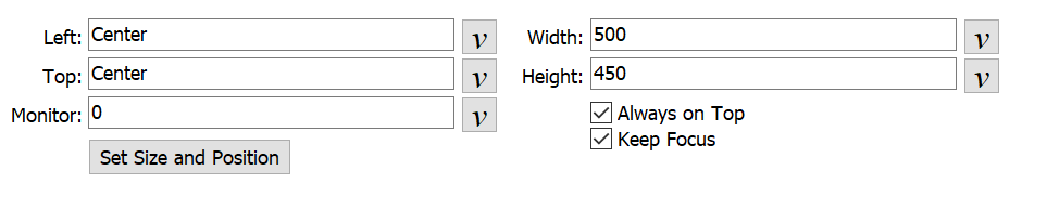 Instead of using pixel coordinates, the window may appear in the center, corners or midpoints of the screen by using the Dialog Positioner. Pressing the Set Size and Position button activates the Dialog Positioner and Dialog Sizer windows.